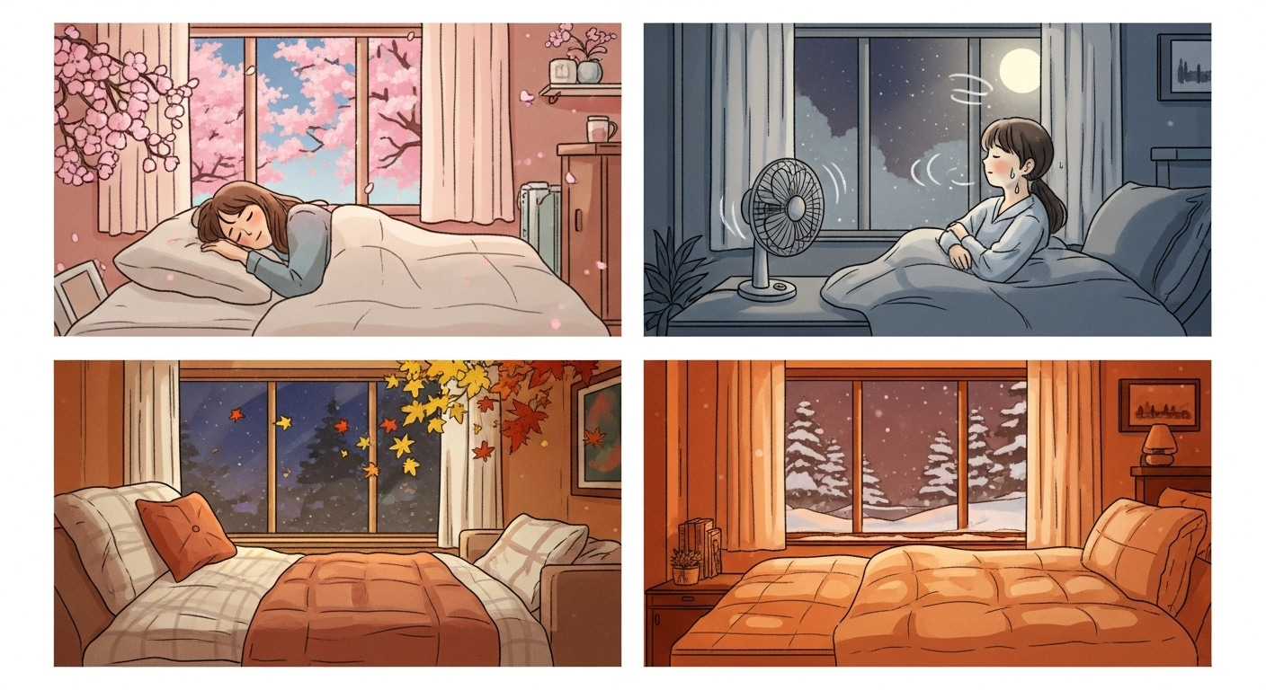 계절에 따라 우리의 수면패턴은 일조량, 온도, 활동량 등 다양한 요인에 의해 변화합니다. 봄은 생체리듬의 변화, 여름은 더위와 습도, 가을과 겨울은 햇빛 부족과 멜라토닌 증가가 주요 원인입니다. 이러한 수면 변화에 적절히 대처하고, 계절에 맞는 수면 환경을 조성함으로써 보다 건강한 생활 리듬을 유지할 수 있습니다. 지금 자신의 수면 상태를 점검하고, 계절에 맞는 수면 습관을 시작해보세요!