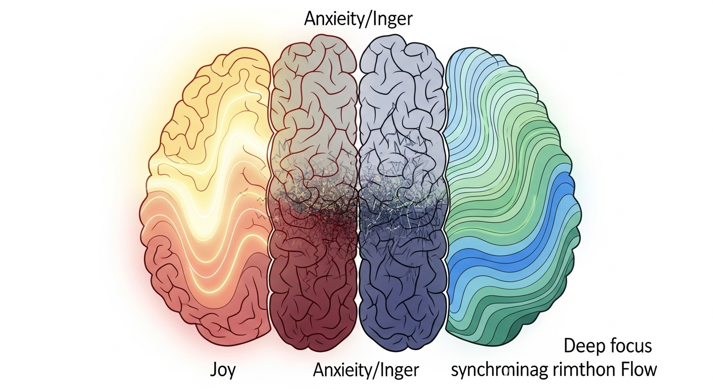 감정은 단순히 주관적인 느낌에 그치지 않습니다. 최근 신경과학 연구에 따르면, 감정은 뇌파 활동의 리듬과 동조 패턴을 통해 객관적으로 관찰될 수 있는 생물학적 신호임이 밝혀지고 있습니다. 본 글에서는 긍정 감정, 부정 감정, 몰입 상태 각각에서 어떤 뇌파 동조 패턴이 나타나는지 과학적으로 분석하고, 이를 실천적으로 활용할 수 있는 방향까지 살펴보겠습니다.