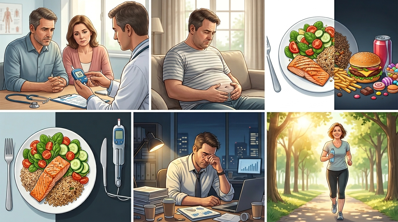 생활습관은 당뇨 발생에 있어 가장 큰 영향을 미치는 요소 중 하나입니다. 특히 40대는 사회적 책임이 커지면서 건강 관리가 소홀해지기 쉬운 시기입니다. 잦은 야근, 회식, 불규칙한 식사, 운동 부족 등은 모두 혈당 조절에 부정적인 영향을 미칩니다. 현대인의 식습관은 과거에 비해 탄수화물과 당류 섭취가 크게 증가한 것이 특징입니다. 흰쌀밥, 빵, 설탕이 많이 들어간 음료와 같은 음식은 혈당을 빠르게 상승시키며, 반복적으로 섭취할 경우 인슐린 저항성을 악화시킵니다. 또한 가공식품과 패스트푸드는 지방과 나트륨 함량이 높아 대사 건강을 더욱 악화시킵니다. 운동 부족 역시 큰 문제입니다. 신체 활동이 부족하면 근육이 줄어들고, 혈당을 소비할 기회가 줄어들어 혈당이 쉽게 높아집니다. 특히 장시간 앉아서 일하는 직장인의 경우 이러한 위험이 더욱 큽니다. 하루 30분 이상의 걷기나 근력 운동만으로도 혈당 조절에 큰 도움이 될 수 있습니다. 스트레스 또한 중요한 요인입니다. 스트레스가 지속되면 코르티솔과 같은 호르몬이 증가하여 혈당을 상승시키고, 식욕을 증가시켜 과식을 유도합니다. 여기에 수면 부족까지 겹치면 인슐린 감수성이 떨어지고, 체중 증가로 이어지는 악순환이 반복됩니다. 결국 생활습관은 당뇨 예방의 핵심이며, 작은 변화라도 꾸준히 실천하는 것이 중요합니다. 규칙적인 식사, 충분한 수면, 스트레스 관리, 지속적인 운동이 모두 함께 이루어져야 효과를 볼 수 있습니다.